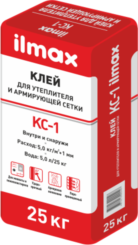 ilmax KC-1 предназначен для создания армированного слоя, а также для приклеивания теплоизоляционных плит из минеральной ваты или пенополистирола в легких штукатурных системах утепления. Используется при утеплении новых и эксплуатируемых зданий на основаниях из кирпича, блоков, бетона, цементных и цементно-известковых штукатурок и других минеральных основаниях. Имеет высокий коэффициент паропроницаемости.