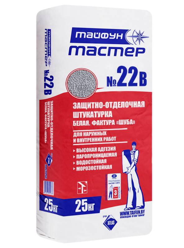«Тайфун Мастер» №22в(с) является декоративной и защитной отделкой поверхности фасадов и внутренних стен. Защитно-отделочная штукатурка применяется для устройства защитно-декоративного слоя с фактурой «шуба». Используется в легкой штукатурной системе теплоизоляции «Тайфун», а так же для устройства отделочных покрытий по минеральным основаниям внутри и снаружи зданий и сооружений. Может эксплуатироваться без окраски.