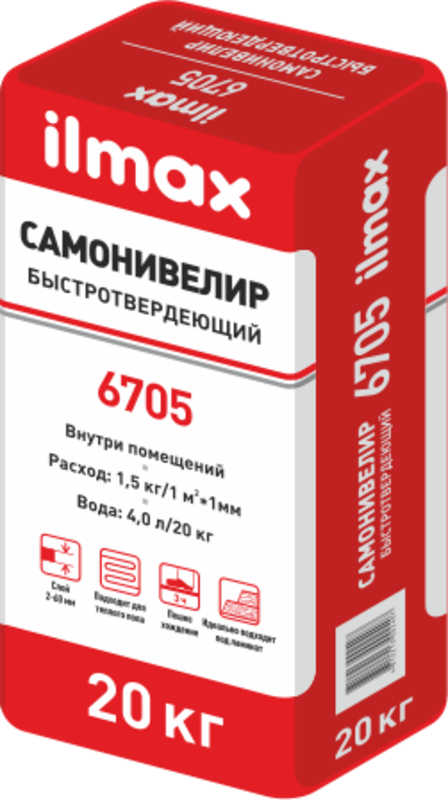 ilmax 6705 предназначен для выравнивания минеральных оснований: бетона, цементно-песчаных стяжек, в том числе с подогревом. Используется для создания ровных оснований под различные виды напольных покрытий: ламинированные и пробковые полы, паркетная доска, керамическая плитка и плитка ГРЕС. Подходит под рулонные покрытия (линолеум и др.) в жилых помещениях.